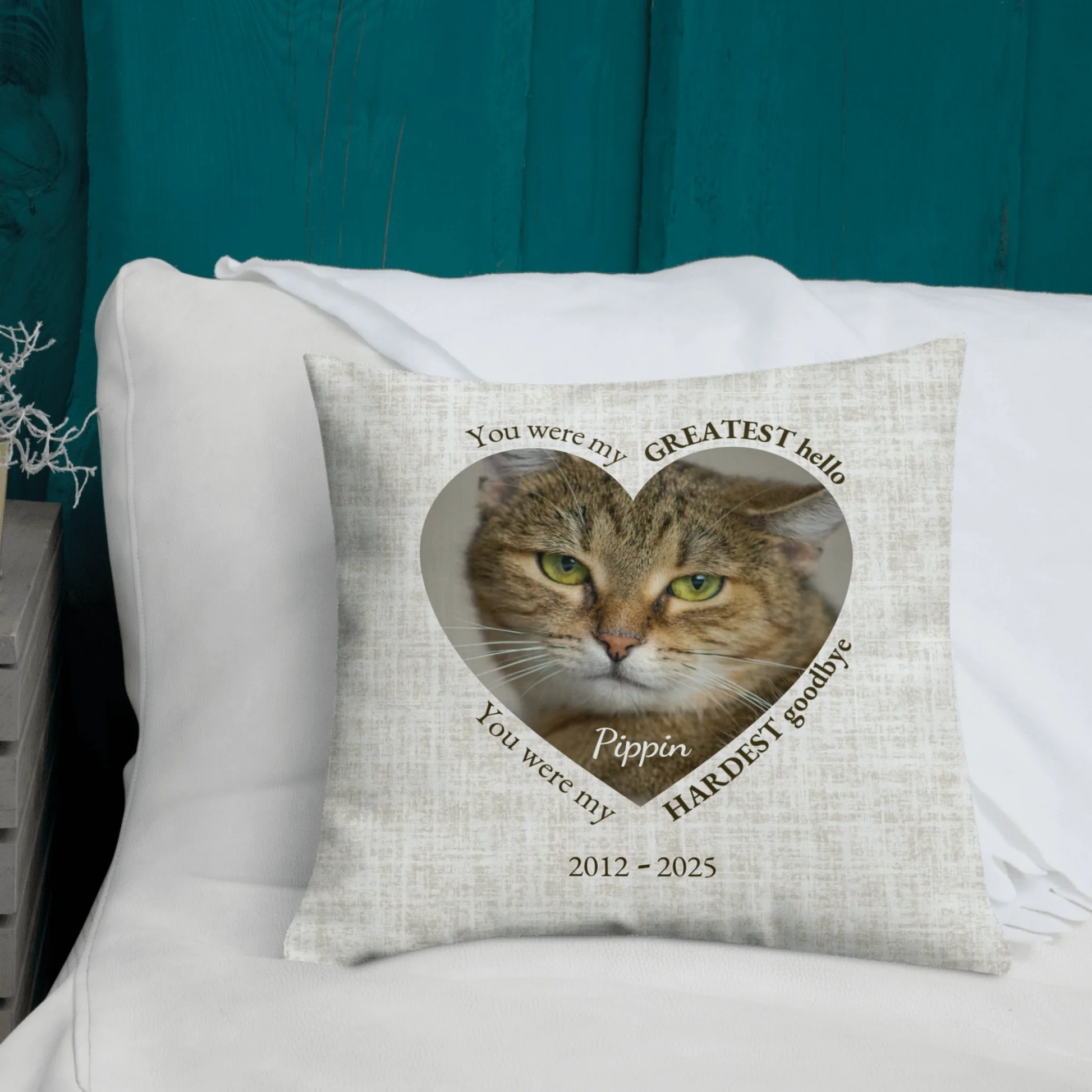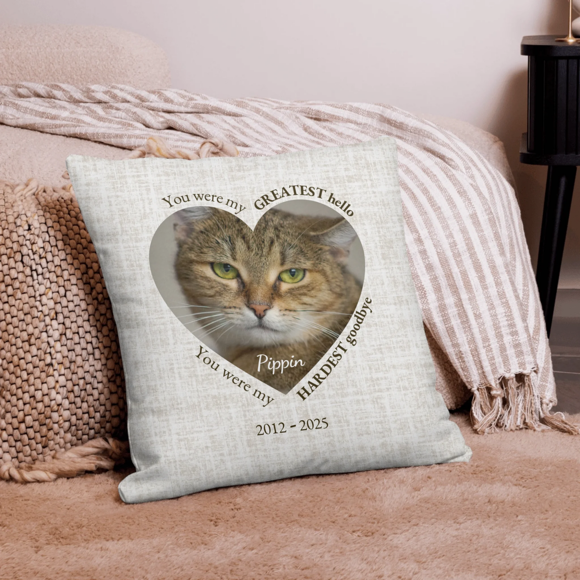 Soft, timeless, and made to be displayed or held when comfort is needed most, this pillow serves as a gentle reminder of the bond you shared—your favorite hello, and your hardest goodbye.