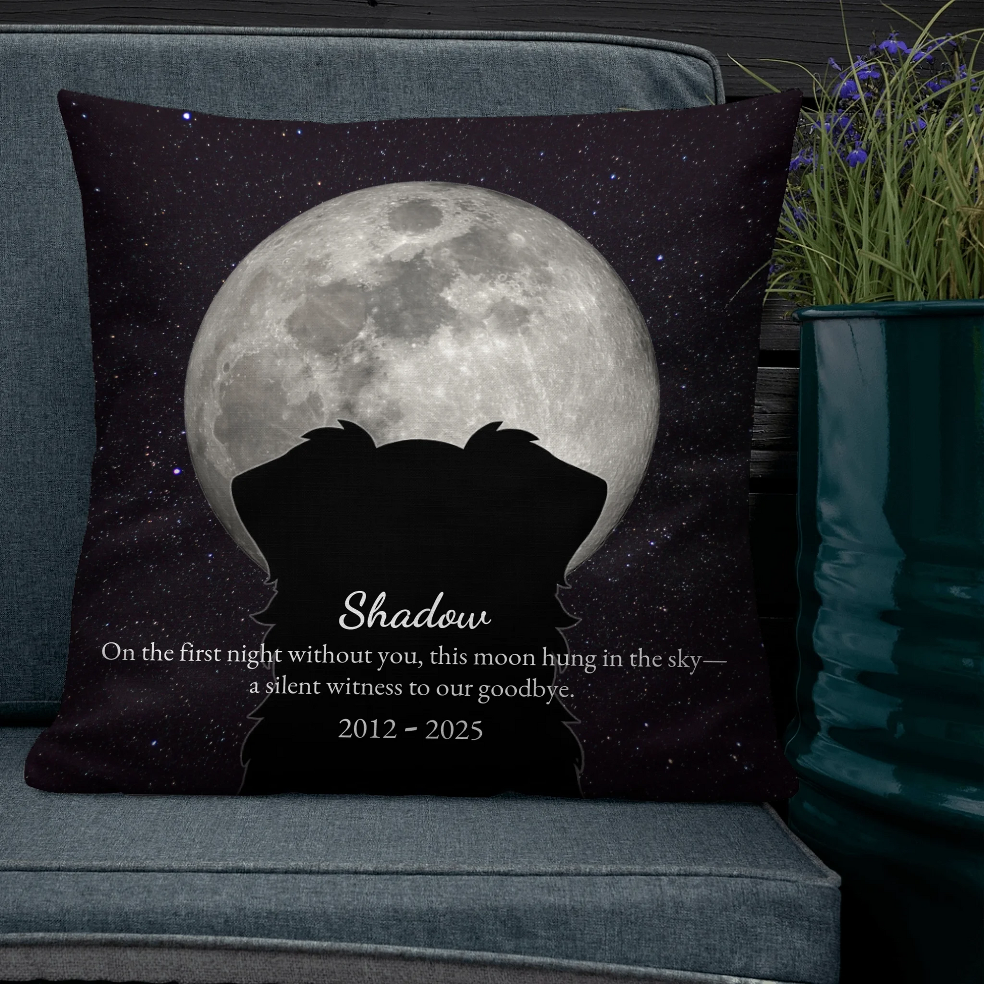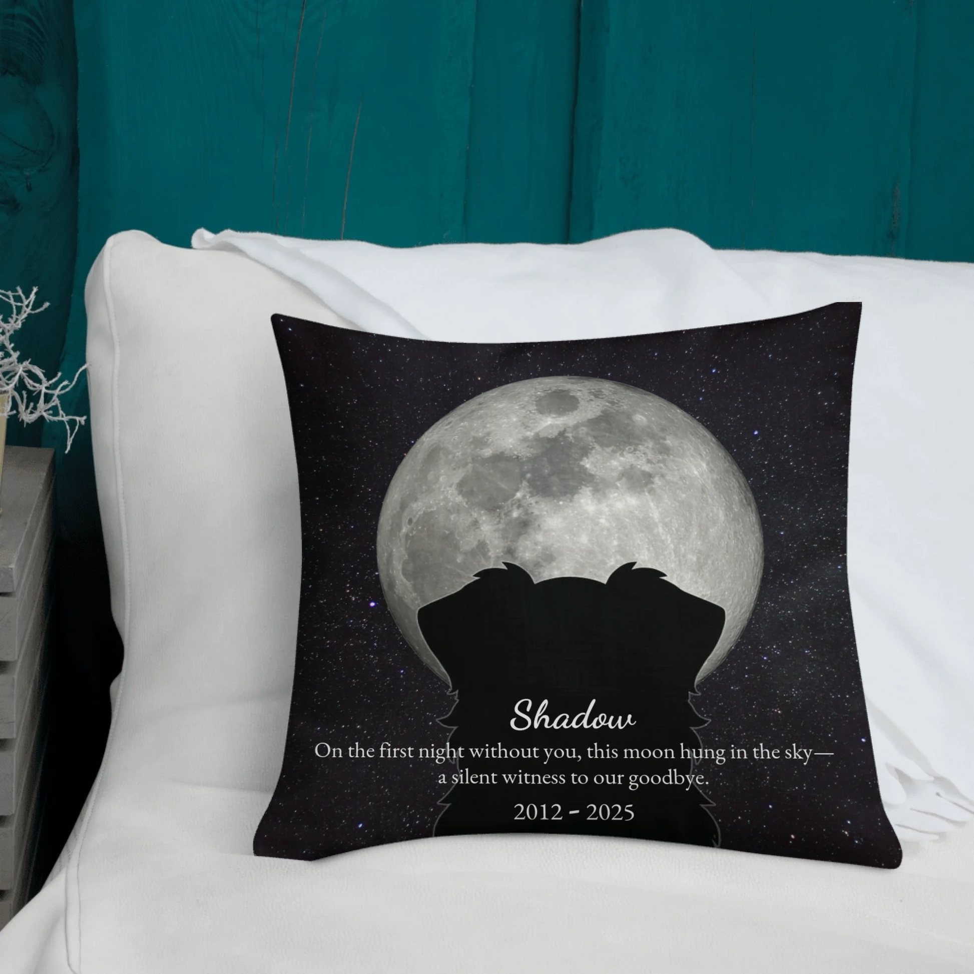 This personalized memorial pillow is designed as one of those pet memorial gifts that speaks quietly but deeply. Featuring your pet’s silhouette gazing at the moon from the night they passed, it captures a moment that mattered—the first night without them.